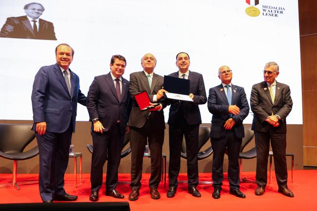 19/11/2025 – SÃO PAULO – O Vice-Presidente do Tribunal de Contas do Estado de São Paulo (TCESP), Conselheiro Dimas Ramalho, recebeu, na terça-feira (18/11), a Medalha de Honra e Mérito da Gestão Pública em Saúde ‘Walter Leser’. A solenidade, às 18h00, na Sala São Paulo, homenageou 25 autoridades públicas e 5 entidades que colaboraram para a melhoria dos serviços públicos na área da saúde.