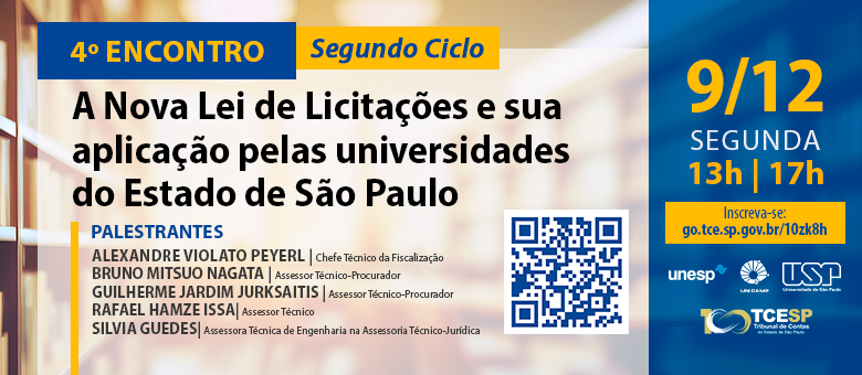 Voltado para os servidores das Universidades e do TCESP, o quarto evento sobre o tema visa tirar as dúvidas dos participantes sobre a Nova Lei de Licitações e Contratos (14.133/2021) e a sua aplicação pelas Universidades do Estado de São Paulo sob o prisma de decisões recentes do Tribunal de Contas.