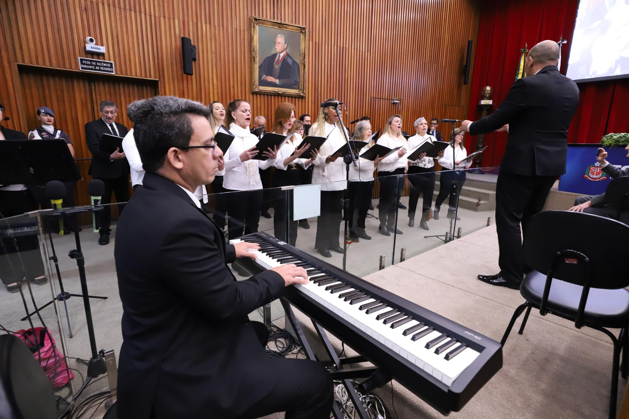 O encerramento das atividades ainda contou com a apresentação dos servidores que compõem o Coral do TCESP. Conduzido pelo Subtenente e Maestro Jeimes Henrique Mota e pelo Cabo e Regente Samuel Gomes de Paula, o Coral brilhou com um repertório variado de músicas inspiradoras que emocionaram o público presente no Auditório Nobre.