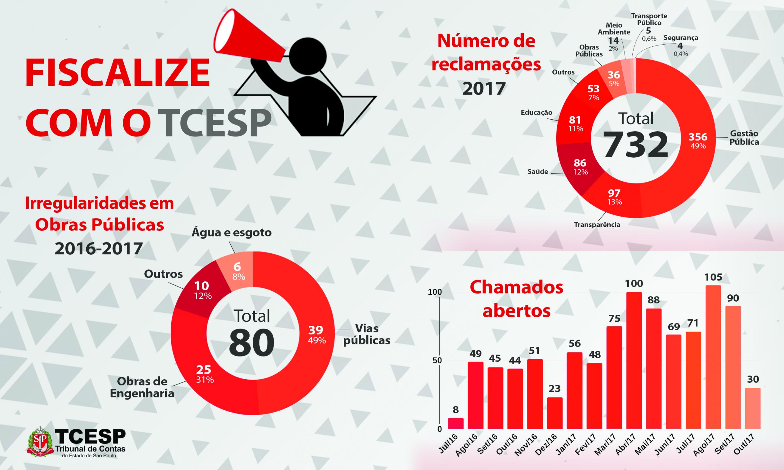 Considerando as denúncias de obras públicas, as irregularidades em vias públicas, obras de engenharia e água e esgoto foram alvos da maioria das denúncias. Neste quesito, Ribeirão Preto, São Vicente, Jundiaí, São Paulo, Araraquara e Jaboticabal foram os municípios que registraram o maior número de reclamações.