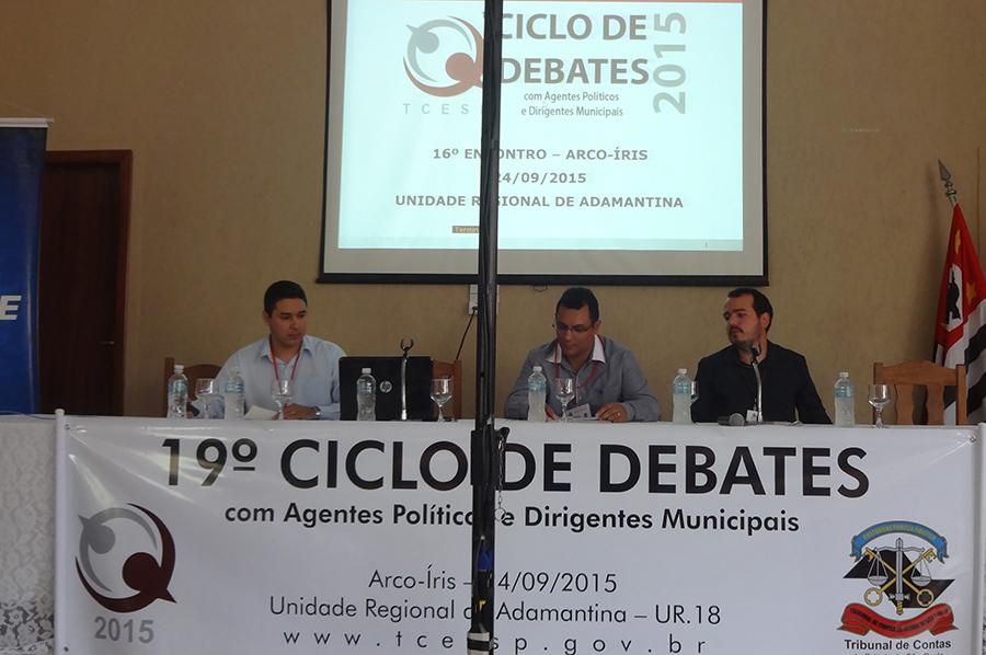Cerca de 180 (cento e oitenta) participantes acompanharam, no Clube Recreativo de Arco-Íris, as exposições sobre Controle Interno, Ensino e Iluminação Pública, feitas pelos técnicos da Regional Eurico Marcos Pereira de Souza, Wellinton Fernando Saldeira e Raul Teixeira Silva. O Sebrae-SP apresentou o tema ‘Licitação à Luz da LC nº 147/2014’, ministrado pelo consultor Roberto Serafim de Souza.