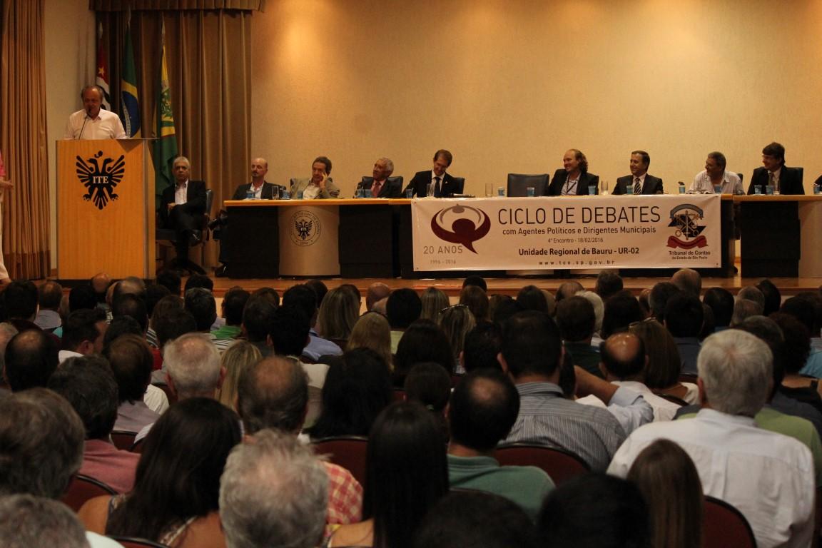 19/02/16 – BAURU – Representantes de 42 (quarenta e dois) municípios jurisdicionados do Tribunal de Contas do Estado de São Paulo (TCESP) na região administrativa de Bauru participaram, na quinta-feira (18/02), às 14h00, no Instituto Toledo de Ensino (ITE), do quarto encontro do Ciclo de Debates com Agentes Políticos e Dirigentes Municipais. O evento contou com a presença do Presidente do TCE, Conselheiro Dimas Eduardo Ramalho, Diretores e equipe técnica.