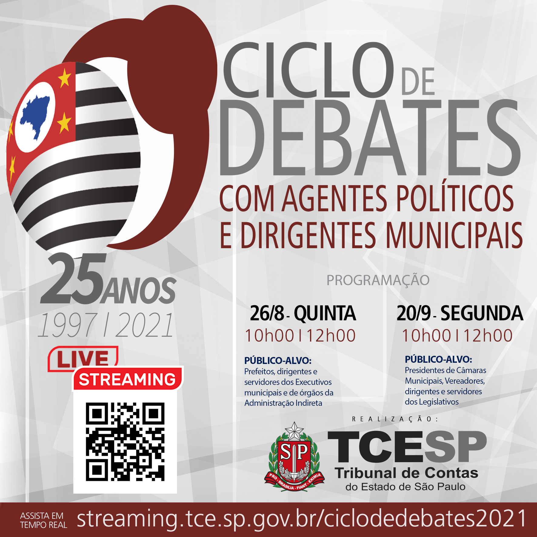 16/08/2021 - SÃO PAULO - O Ciclo de Debates com Agentes Políticos e Dirigentes Municipais promovido pelo Tribunal de Contas do Estado de São Paulo (TCESP) completa 25 anos em 2021. O evento, realizado anualmente e de forma ininterrupta, faz parte da estratégia pedagógica que a Corte vem adotando nos últimos anos e tem como objetivo orientar Prefeitos, Vereadores, Secretários Municipais, gestores, lideranças políticas e demais interessados sobre boas práticas administrativas.