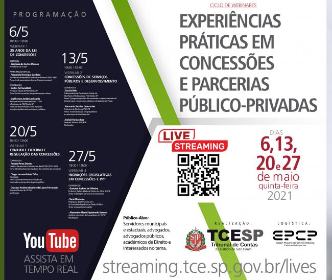 CICLO DE WEBINÁRIOS DO TCESP Experiências Práticas em Concessões e Parcerias Público-Privadas Data: 6, 13, 20 e 27 de maio Horário: 10h30 às 12h00 Transmissão pelo YouTube: http://streaming.tce.sp.gov.br/lives/