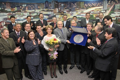 10/06/14 – FERNANDÓPOLIS – Em uma noite repleta de autoridades e lideranças políticas e municipais de todo o Estado, o Conselheiro Dimas Eduardo Ramalho, recebeu, na sexta-feira (6/5), às 20h00, o título de cidadão benemérito fernandopolense, honraria concedida pelos vereadores da Câmara Municipal de Fernandópolis.