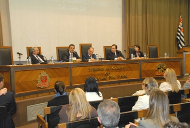 Na mesa solene de encerramento, ao lado do presidente do Tribunal e do ministro da Justiça, estavam o Dr. Adib Kassouf Sad, presidente da Comissão de Direito Administrativo da OAB-SP, Dr. Márcio Cammarosano, coordenador do curso de especialização em Direito Administrativo da PUC/COGEAE, Presidente do IBDA e coordenador científico do Congresso e a Dra. Karina Kufa, secretária geral da Comissão de Direito Administrativo da OAB-SP e também coordenadora do evento.