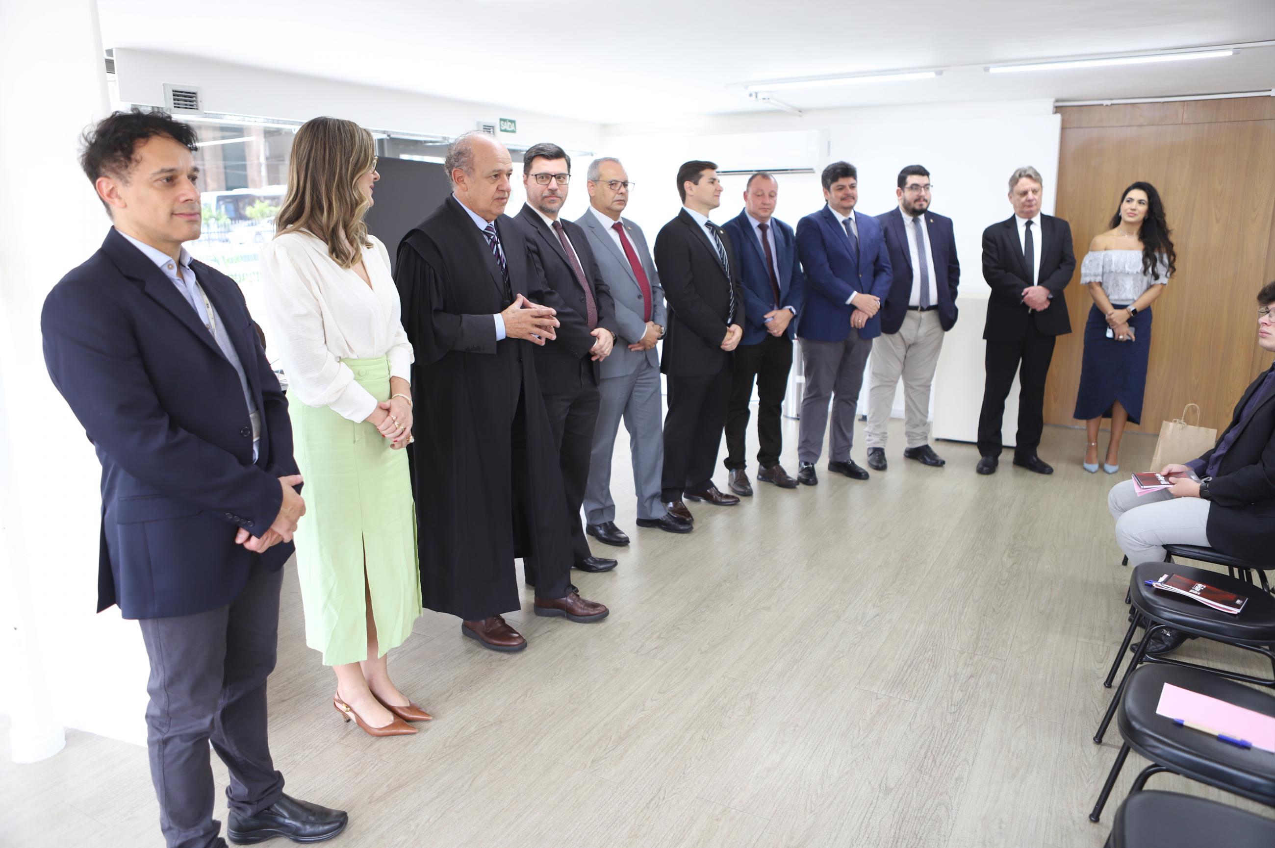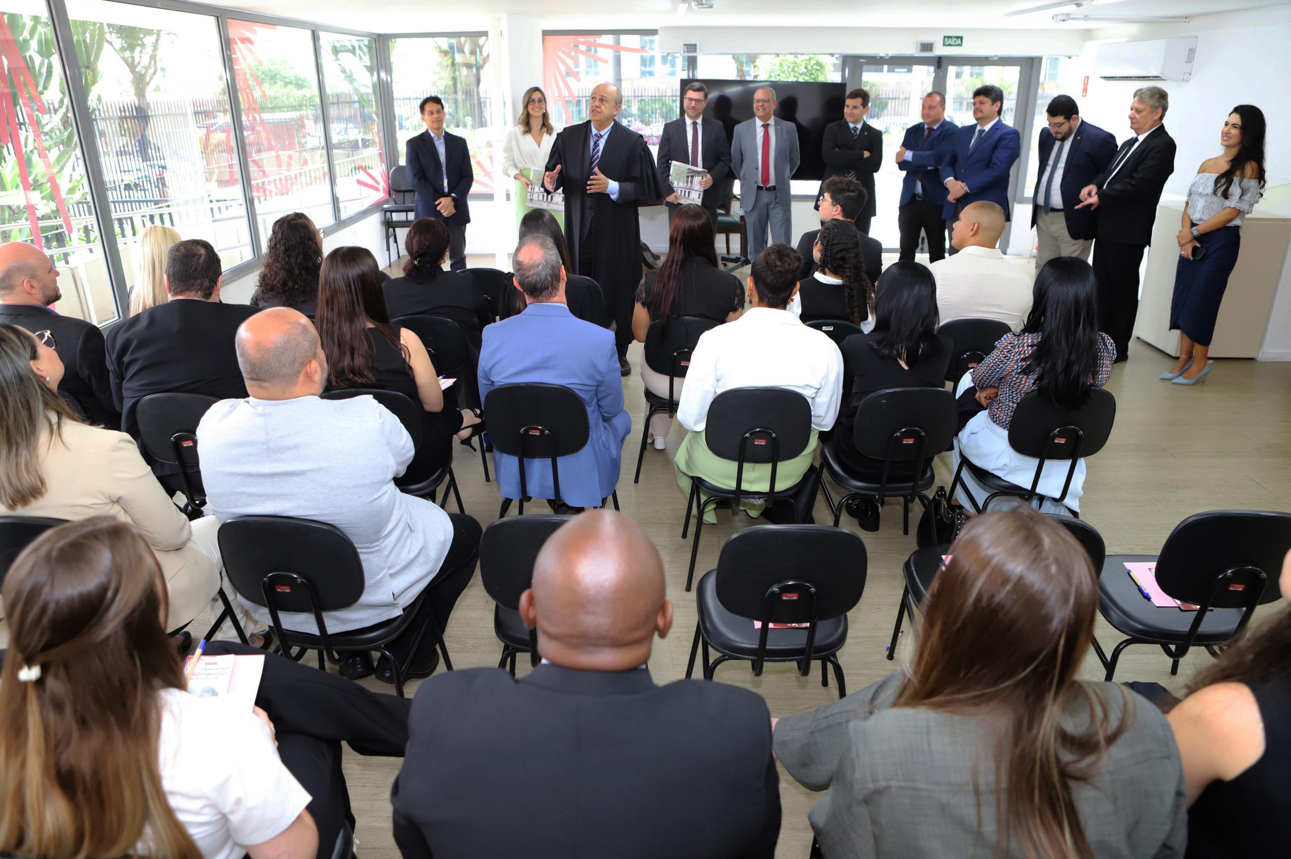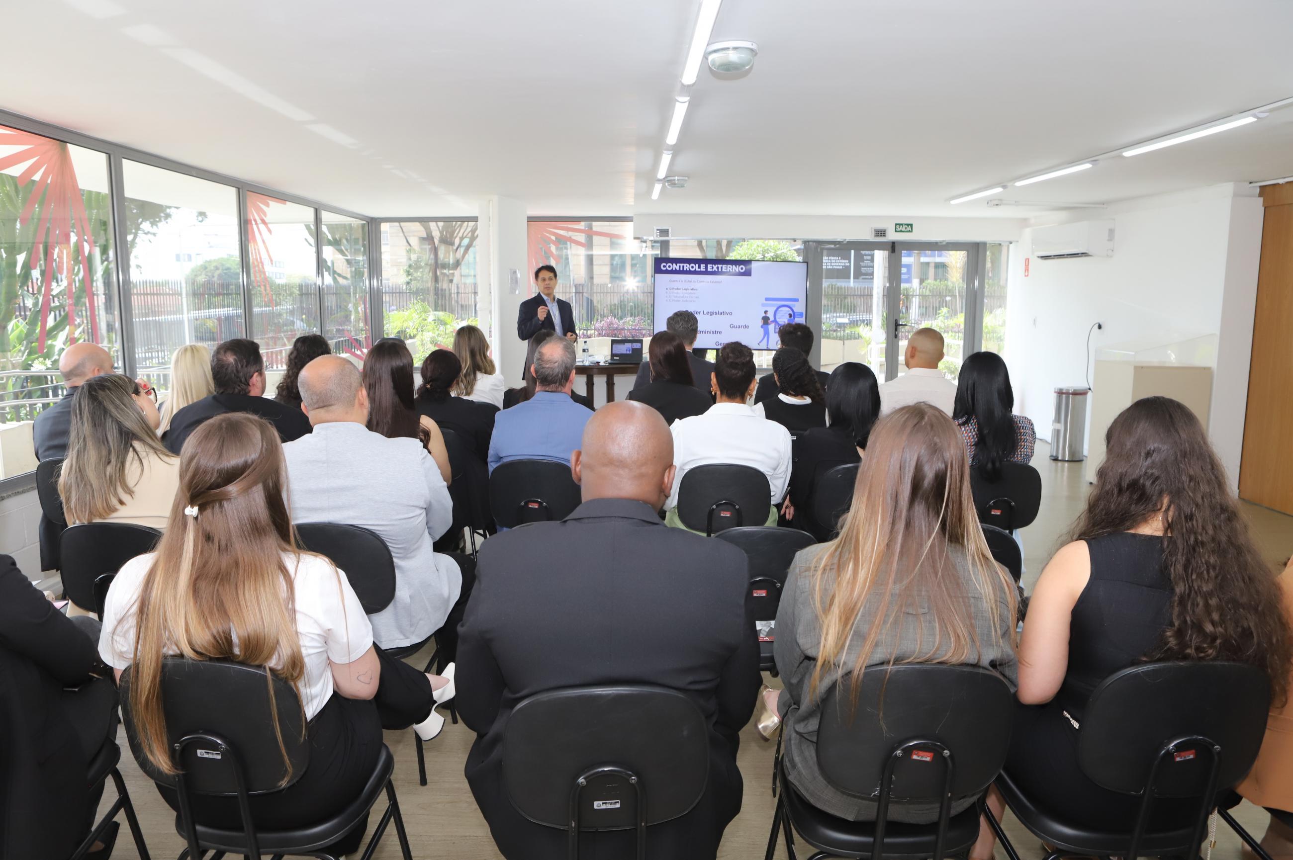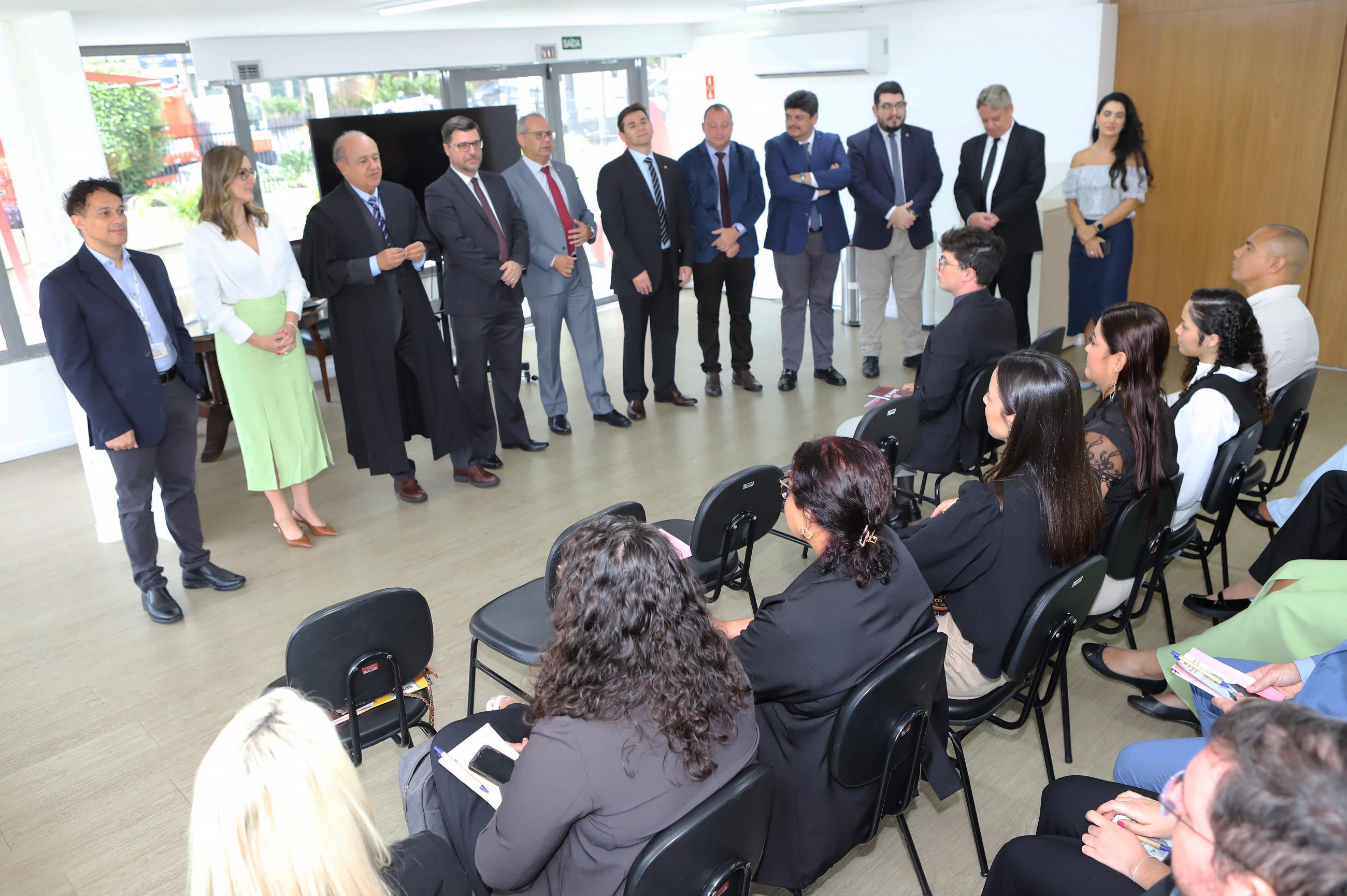 A comitiva foi acompanhada pelo Coordenador do curso, Professor Gustavo Henrique Schneider Nunes, e pela Professora Mariana Passafaro Mársico Azadinho, sendo recepcionada pelo Vice-Presidente do TCESP, Conselheiro Dimas Ramalho, e equipe técnica.
