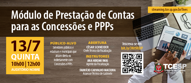 O evento, direcionado aos Servidores públicos e estaduais e municipais que atuam direta ou indiretamente com Concessões e PPPs, acontecerá no Auditório Nobre ‘Professor José Luiz de Anhaia Mello’, com transmissão em tempo real pela TVTCE no YouTube (https://streaming.tce.sp.gov.br/lives).