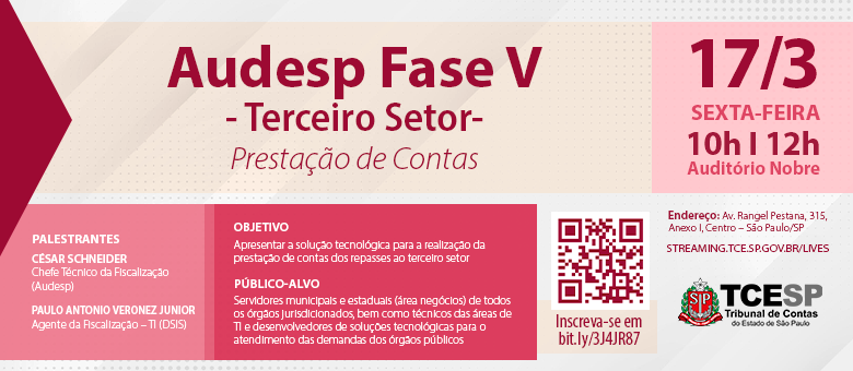 13/03/2023 – SÃO PAULO – Com o propósito de tratar sobre os repasses públicos ao Terceiro Setor, o Tribunal de Contas do Estado de São Paulo (TCESP) realiza, na sexta-feira (17/3), das 10h00 às 12h00, no Auditório Nobre “Professor José Luiz de Anhaia Mello”, orientação sobre a fase V do Sistema de Auditoria Eletrônica do Estado de São Paulo (Audesp).