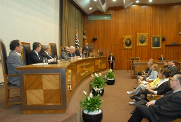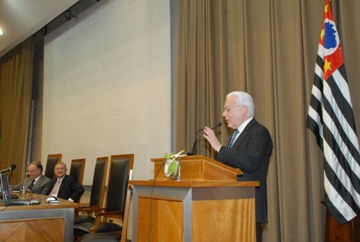 O dr. Cláudio apresentou o primeiro palestrante, prof. Sérgio Ferraz – e em seguida foi desfeita a mesa solene, da qual fizeram parte além dos presidentes do TCESP e do IBDA e do professor Sérgio Ferraz, o outro palestrante do dia, desembargador Jessé Torres Pereira Jr., o auditor coordenador do Corpo de Auditores, Alexandre Manir Figueiredo Sarquis, o procurador chefe da Fazenda Estadual Luiz Menezes Neto, o diretor geral Sérgio Rossi, e o diretor geral de Administração Carlos Magno de Oliveira.