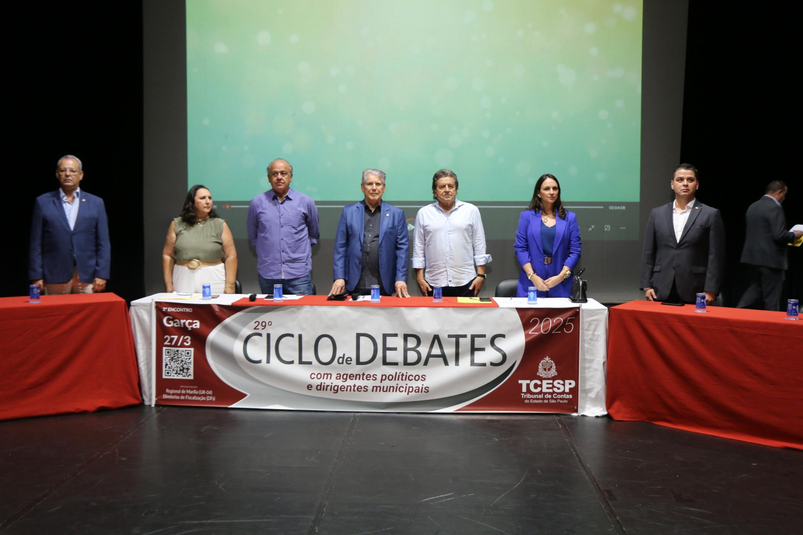 Na mesa de abertura do encontro, além do Conselheiro-Presidente, também estiveram presentes, o Conselheiro-Corregedor do TCESP, Dimas Ramalho; a Procuradora-Geral de Contas (MPC), Letícia Formoso Delsin Matuck Feres; o Secretário-Diretor Geral, Germano Fraga Lima; o Diretor da Unidade Regional de Marília (UR-4), Agnon Ribeiro de Lima; o Prefeito de Garça, José Alcides Faneco; e a Presidente da Câmara dos Vereadores da Garça, Raquel Sartori.