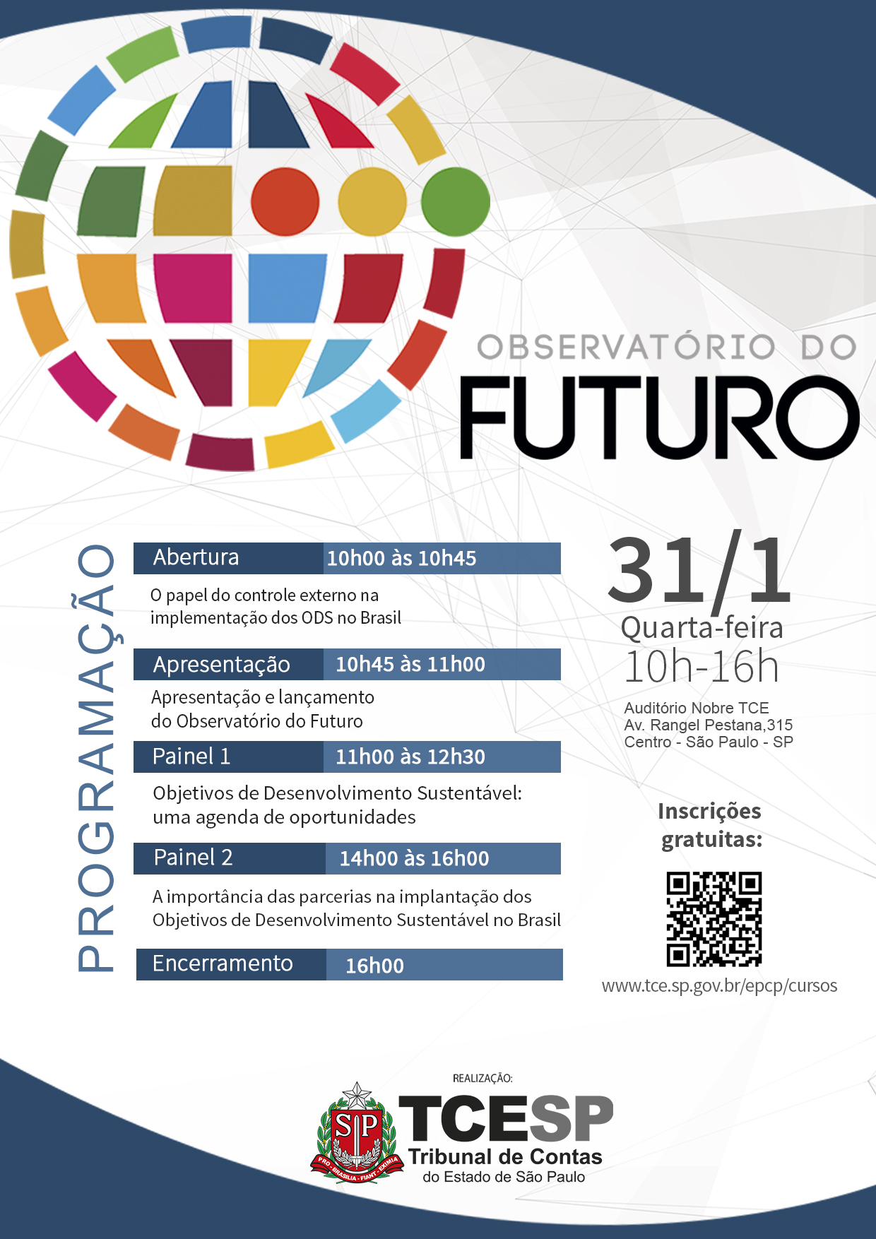 24/01/2018 - SÃO PAULO - O Tribunal de Contas do Estado de São Paulo (TCESP) promove na próxima quarta-feira (31/1),das 10h00 às 16h00, no auditório nobre, na capital, uma série de palestras sobre os Objetivos de Desenvolvimento Sustentável (ODS). Os debates serão promovidos durante o lançamento do Observatório do Futuro, núcleo criado pela Corte para monitorar a implementação dos ODS no Estado.