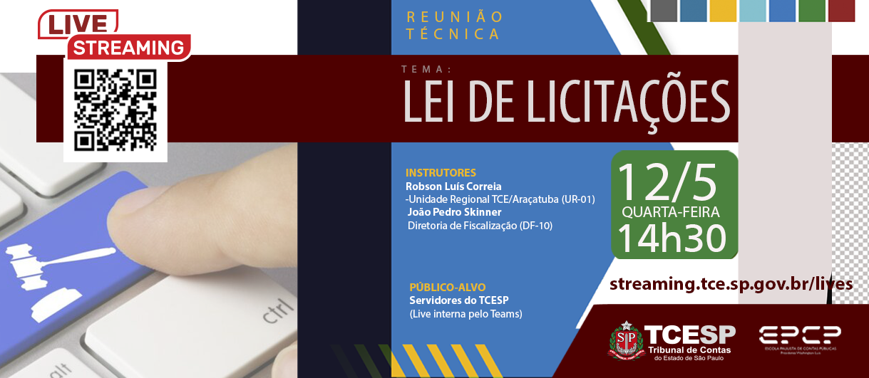 10/05/2021 – SÃO PAULO – Com o objetivo de abordar as mudanças estabelecidas pela nova Lei de Licitações (Lei nº 14.133/21), com ênfase na atuação do controle externo, o Tribunal de Contas do Estado de São Paulo (TCESP) realiza, na quarta-feira (12/5), das 14h30 às 16h00, live voltada exclusivamente aos servidores da Casa.