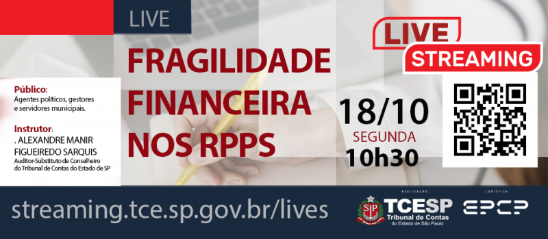 13/10/2021 – SÃO PAULO – Debater endividamento público, déficit atuarial e recursos previdenciários. Com este propósito, o Tribunal de Contas do Estado de São Paulo (TCESP) realiza, na segunda-feira (18/10), das 10h30 às 12h00, a live ‘Fragilidade Financeira nos RPPS’.