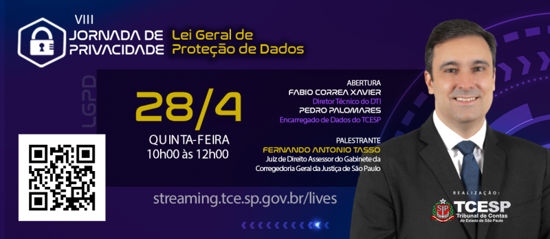 Com transmissão ao vivo pelo YouTube no link http://streaming.tce.sp.gov.br/lives/, o evento traz como convidado o Juiz de Direito e Assessor do Gabinete da Corregedoria Geral do Tribunal de Justiça de São Paulo Fernando Antonio Tasso, que discorrerá sobre as políticas públicas municipais de fomento à proteção de dados pessoais pelo setor privado.