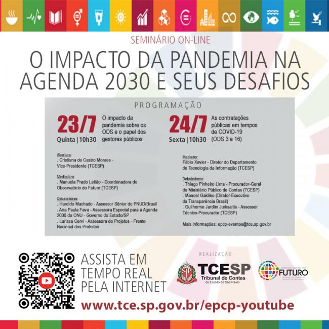 20/07/2020 – SÃO PAULO – O Tribunal de Contas do Estado de São Paulo, por meio do Observatório do Futuro, promove na quinta e na sexta-feira (23 e 24/7) uma série de debates on-line com o tema 'O impacto da pandemia na Agenda 2030 e seus desafios'.
