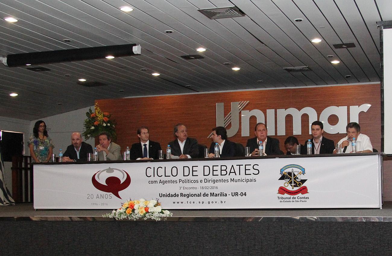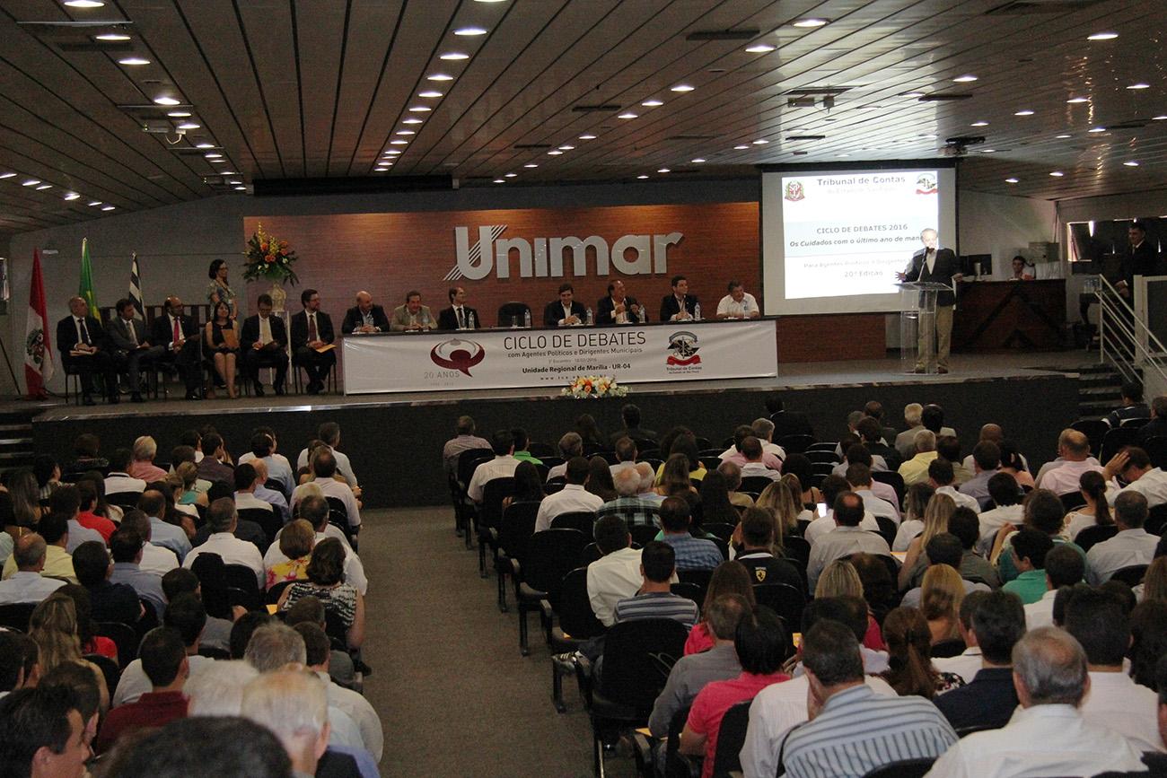19/02/16 – SÃO PAULO – Prefeitos, Presidentes de Câmaras, gestores e servidores públicos da região jurisdicionada do Tribunal de Contas do Estado de São Paulo (TCESP) em Marília, participaram, na quinta-feira (18/2), às 10h00, no auditório 'Professora Filomena Ottaiano Losasso' da Universidade de Marília (UNIMAR), do terceiro encontro da 20ª edição Ciclo de Debates Agentes Políticos e Dirigentes Municipais, evento promovido pela Corte de Contas que tem como objetivo prestar orientações sobre as boas práticas da administração.