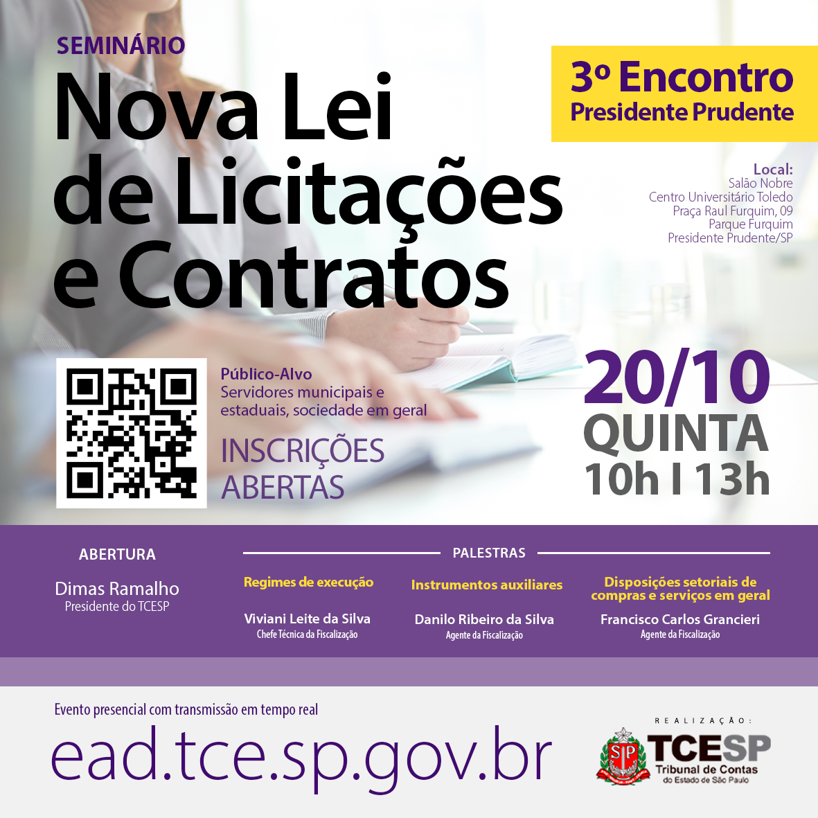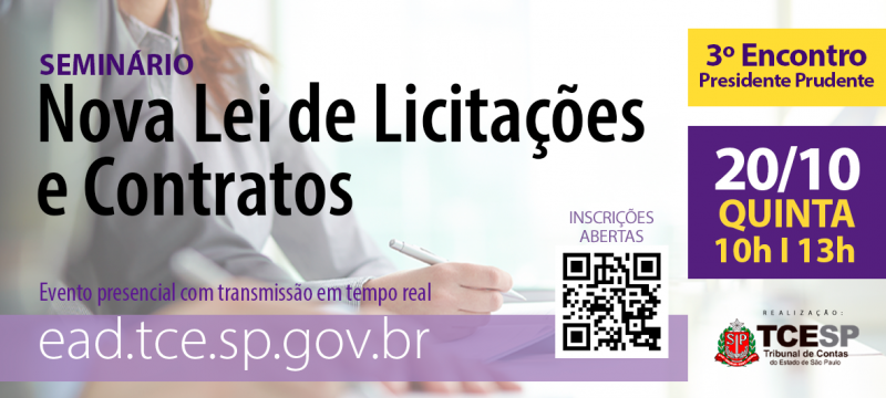 26/09/2022 — SÃO PAULO — O Tribunal de Contas do Estado de São Paulo (TCESP) realiza, na quinta-feira (20/10), das 10h00 às 13h00, o terceiro encontro do seminário ‘Nova Lei de Licitações e Contratos’.