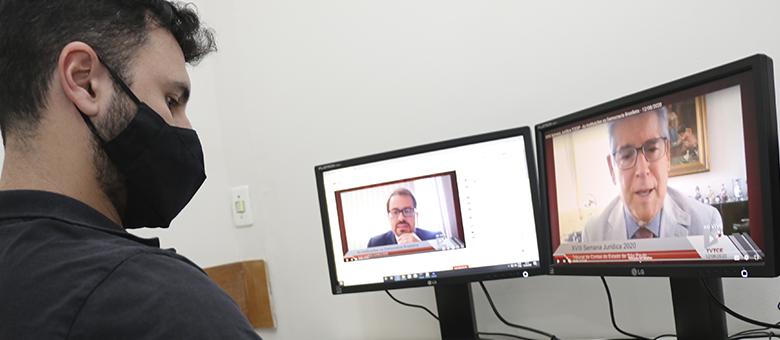 12/08/2020 – SÃO PAULO – As instituições na democracia brasileira foram o assunto central de palestra realizada ontem (12/8), às 10h30, como parte do segundo dia da programação da XVIII Semana Jurídica do Tribunal de Contas do Estado de São Paulo (TCESP). O tema, apresentado pelo Professor Titular de Direito da Universidade de São Paulo (USP) Floriano de Azevedo Marques Neto, teve como mediador o Conselheiro-Decano da Corte, Antonio Roque Citadini.
