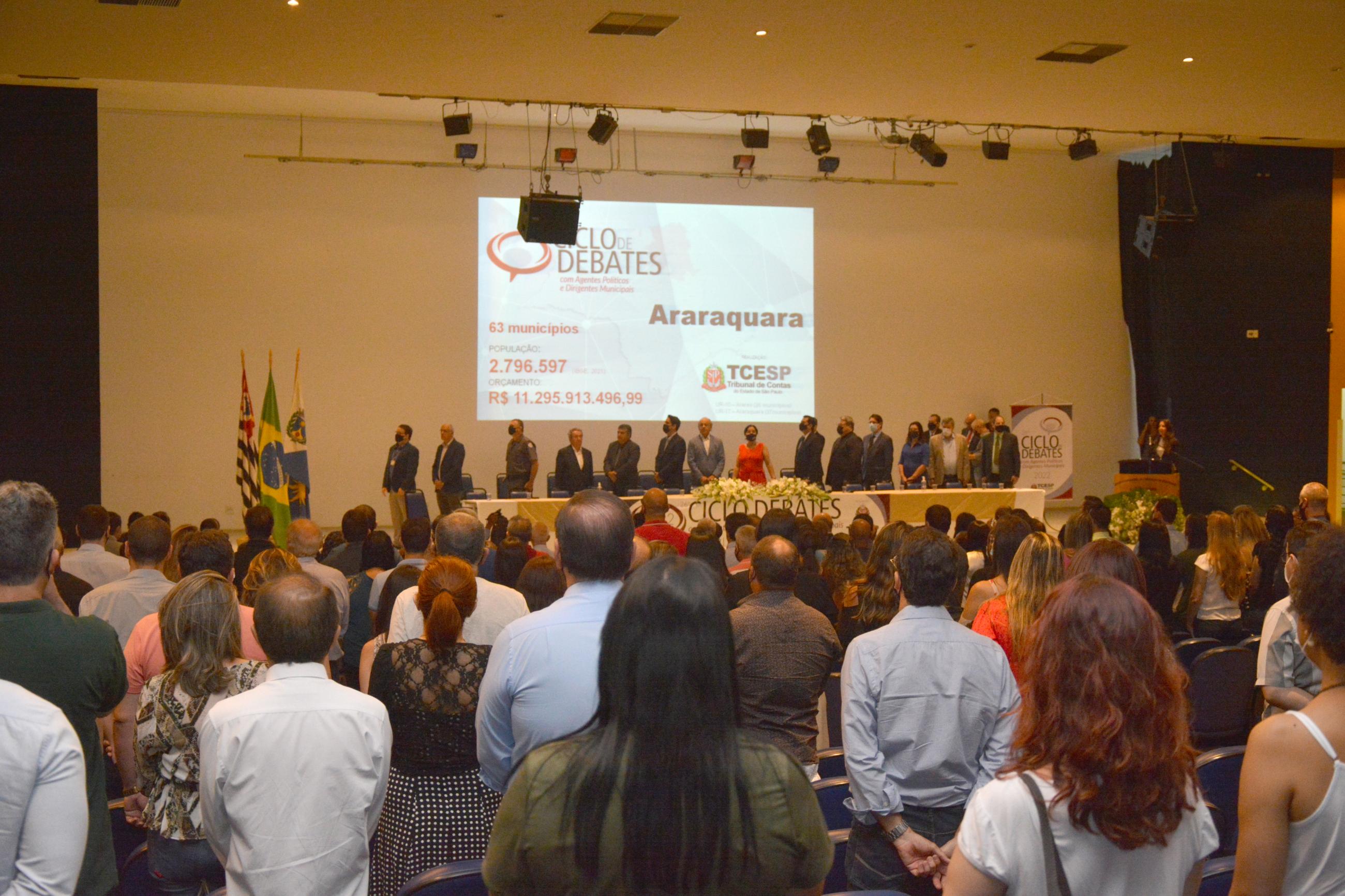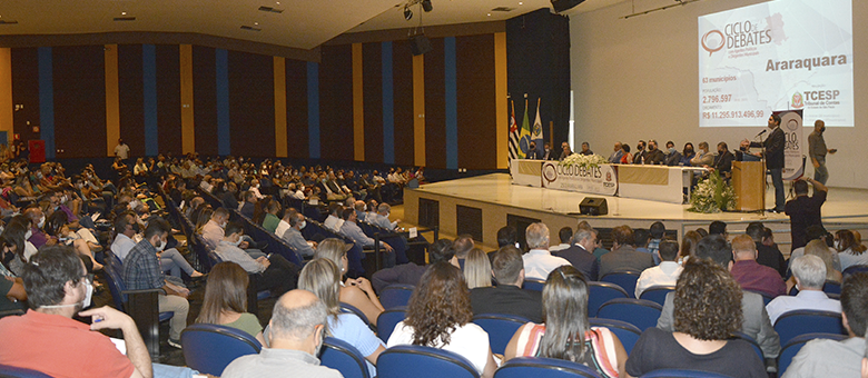 28/03/2022 – SÃO PAULO – Mais de 900 pessoas entre Prefeitos, Vereadores, lideranças políticas, Secretários Municipais, gestores e servidores públicos, representando 63 municípios fiscalizados pelo Tribunal de Contas do Estado de São Paulo (TCESP) nas regiões de Araraquara e Araras, participaram, na sexta-feira (25/3), das 10h00 às 12h00, da segunda reunião do ano do 26º Ciclo de Debates com Agentes Políticos e Dirigentes Municipais. Compareceram ao encontro 31 Prefeitos e 20 Presidentes de Câmaras.