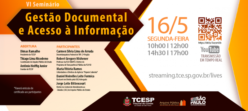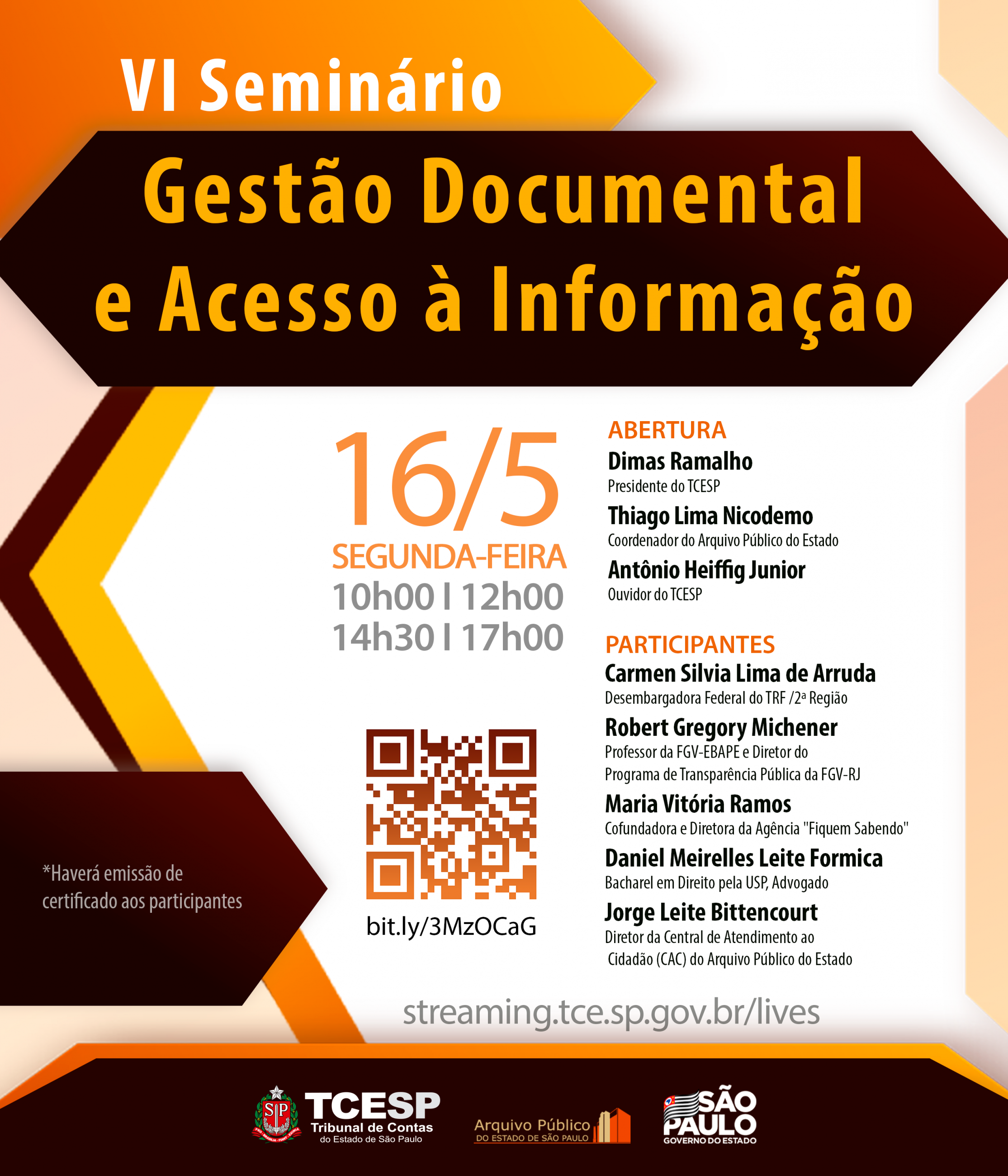 27/04/2022 – SÃO PAULO – O Tribunal de Contas do Estado de São Paulo (TCESP), em parceria com o Arquivo Público do Estado, promove, na segunda-feira (16/5), o VI Seminário de Gestão Documental e Acesso à Informação.