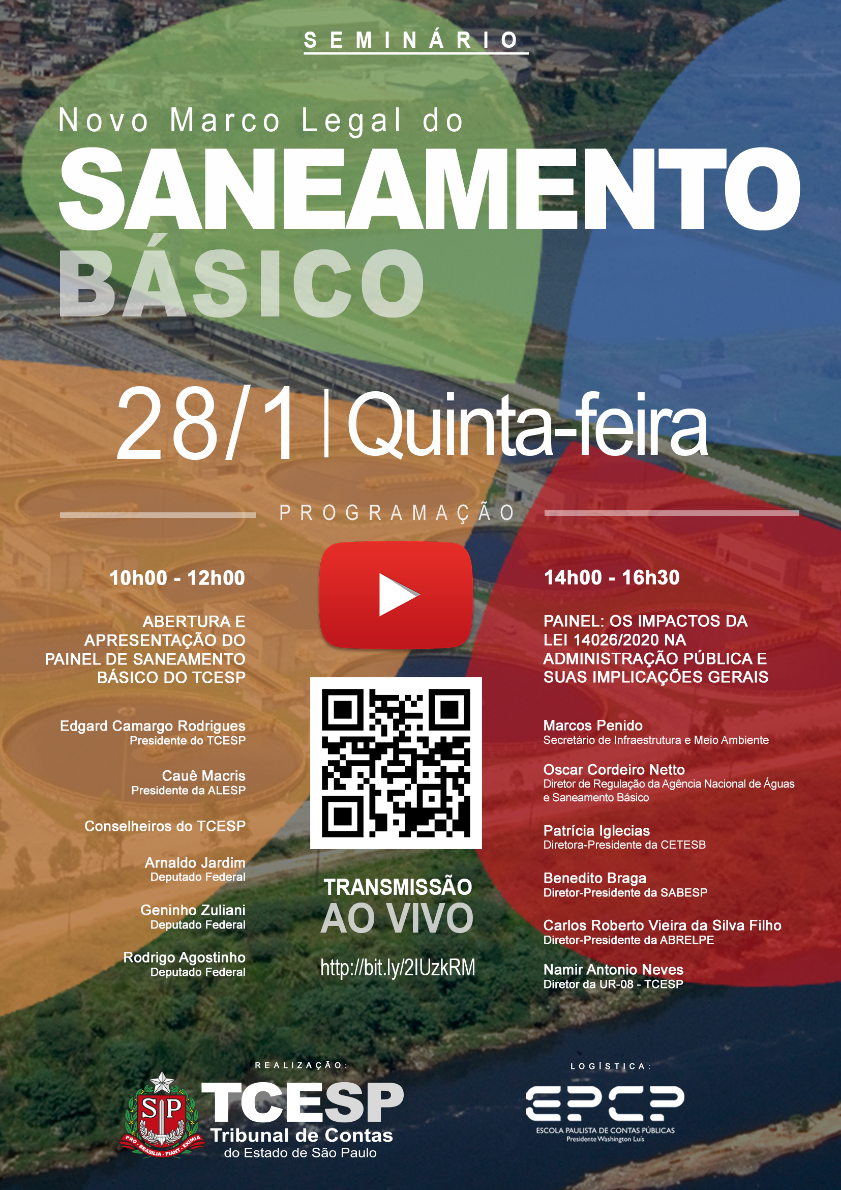 20/01/2021 – SÃO PAULO – Com o propósito de orientar gestores e agentes públicos municipais e estaduais, o Tribunal de Contas do Estado de São Paulo (TCESP) promoverá, no dia 28 de janeiro (quinta-feira), seminário técnico que discutirá a implantação da legislação que estabelece o ‘Marco Legal do Saneamento Básico’. Os trabalhos, que acontecerão das 10h00 às 16h00, são abertos ao público e transmitidos simultaneamente pela internet.