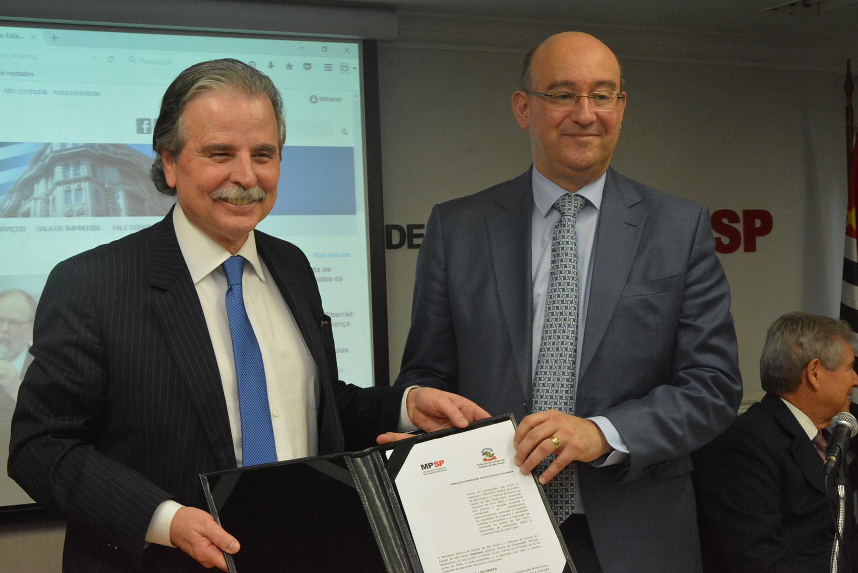 Durante solenidade realizada no auditório do MPSP, na Capital, na quarta-feira (29/8), às 16H00, o Presidente do Tribunal de Contas do Estado (TCESP), Conselheiro Renato Martins Costa, e o Procurador-Geral de Justiça, Gianpaolo Smanio, assinaram termo de cooperação que aproxima o trabalho dos órgãos e institucionaliza as ações articuladas entre a fiscalização da Corte de Contas e as investigações promovidas pelo Ministério Público.