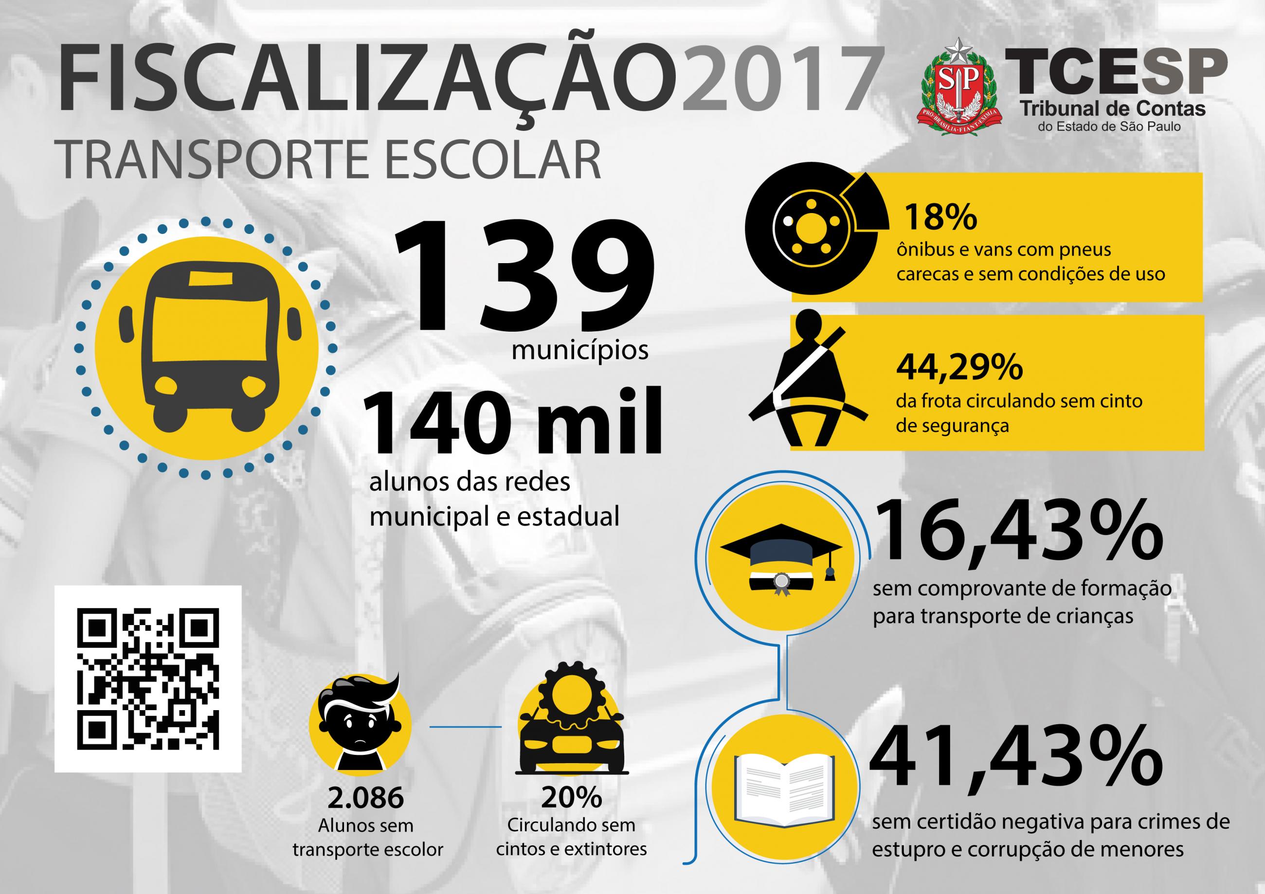 29/11/2017 – SÃO PAULO – Fiscalização-surpresa realizada pelo Tribunal de Contas do Estado de São Paulo no transporte escolar de 139 cidades mostra que em quase metade da frota vistoriada (44,29%) os alunos estavam circulando sem cinto de segurança. Mais de 20% dos veículos também não tinham cintos e extintores de incêndio adequados. Em quase 18% dos ônibus e vans ainda foram encontrados pneus carecas e sem condições de uso.