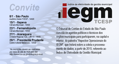 06/01/15 – SÃO PAULO – Com o propósito de mostrar aspectos operacionais do Índice de Efetividade da Gestão Municipal (IEGM) aos municípios o Tribunal de Contas do Estado de São Paulo (TCESP) promoverá em janeiro uma série de 5 (cinco) encontros, na capital e interior, para apresentar o indicador que medirá a qualidade dos investimentos e gastos públicos nas cidades paulistas (confira locais e inscrições). Os dados relativos ao IEGM/TCESP devem ser encaminhados ao Tribunal de Contas até o dia 28 de fevereiro.