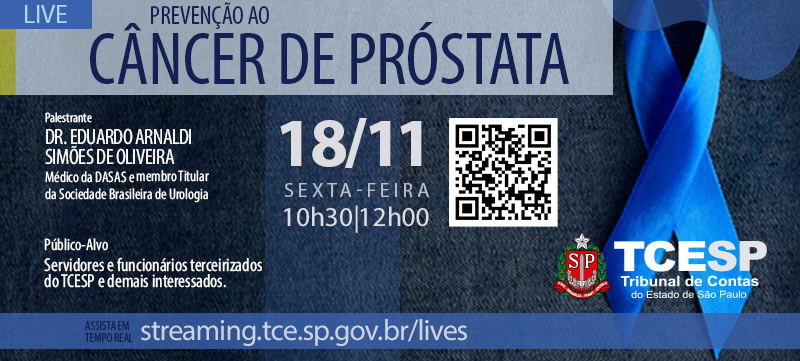 16/11/2022 — SÃO PAULO — Como parte das atividades da campanha ‘Novembro Azul’, o Tribunal de Contas do Estado de São Paulo (TCESP) realiza, na sexta-feira (18/11), das 10h30 às 12h00, live sobre câncer de próstata.