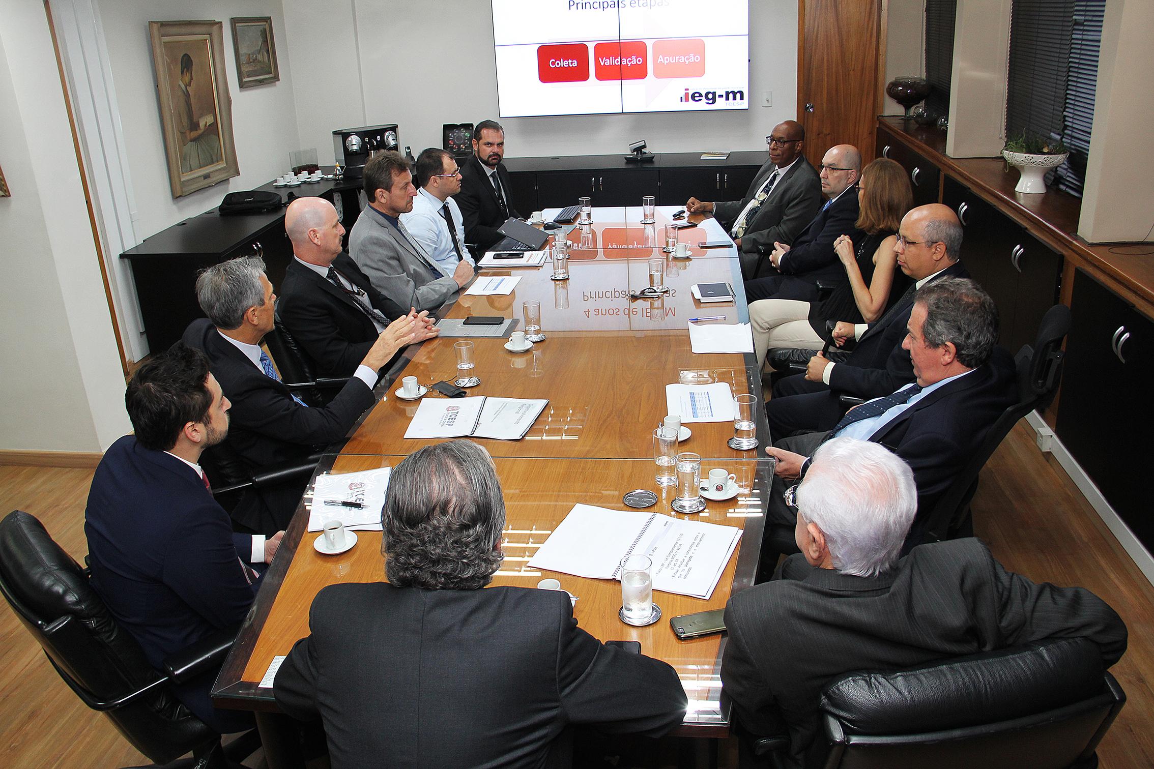 Durante a reunião, que contou com a presença de técnicos e Diretores da Corte de Contas paulista, o Secretário Marcos Vinholi assistiu a uma apresentação sobre a composição e metodologia do Índice de Efetividade da Gestão Municipal (IEG-M).