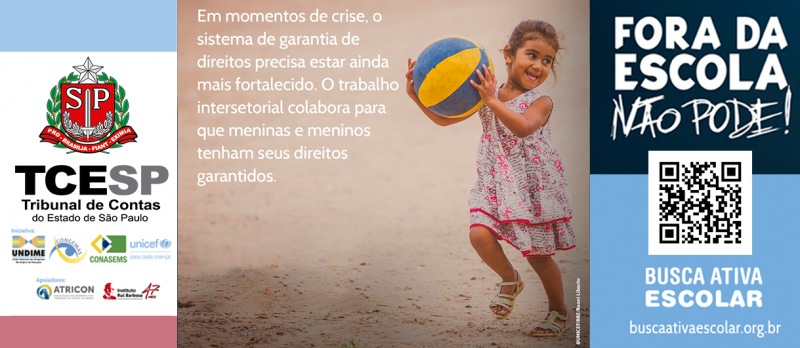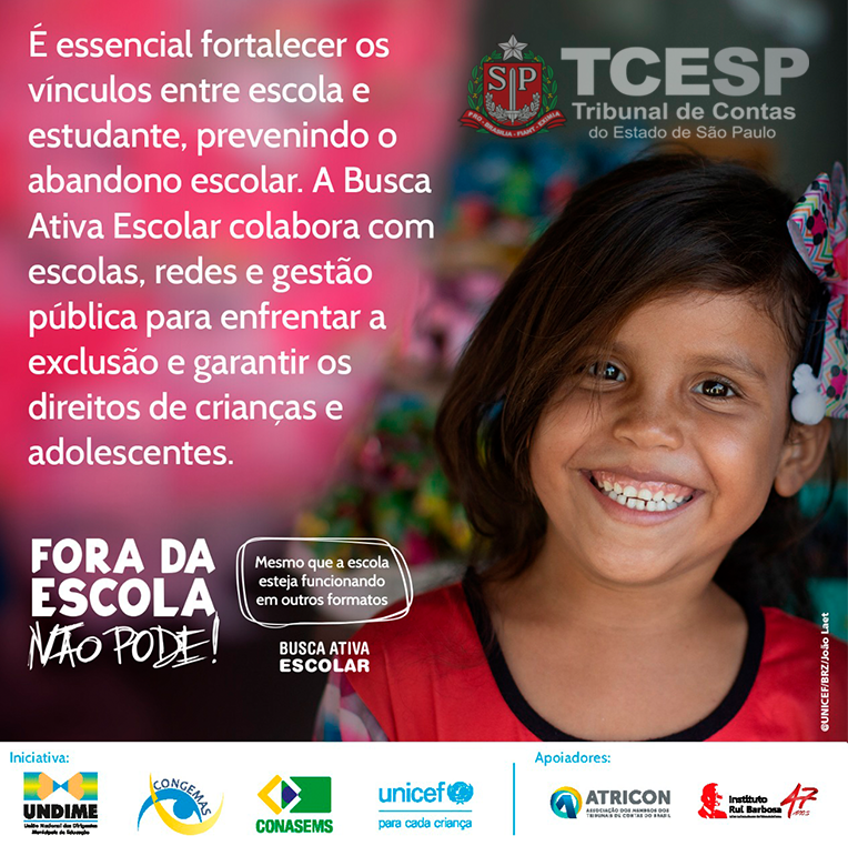 30/04/2021 – SÃO PAULO – O Tribunal de Contas do Estado de São Paulo (TCESP), em conjunto com a Associação dos Membros dos Tribunais de Contas do Brasil (Atricon) e o Instituto Rui Barbosa (IRB), por meio do Comitê Técnico de Educação do IRB (CTE-IRB), aderiu à campanha ‘Fora da Escola Não Pode! Mesmo que a escola esteja funcionando em outros formatos’, uma iniciativa para garantir o aprendizado das crianças e dos adolescentes.