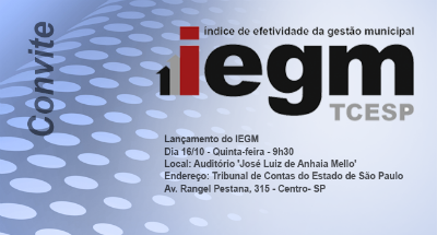 09/10/14 – SÃO PAULO – O Tribunal de Contas do Estado de São Paulo (TCESP) está convidando os jurisdicionados da esfera municipal e estadual, e sociedade civil em geral para participarem, na quinta-feira (16/10), às 9h30, no auditório nobre 'José Luiz de Anhaia Mello', na capital, e na subsede da Escola em Araraquara, do lançamento do Índice de Efetividade da Gestão Municipal (I-EGM), instrumento que tem por finalidade avaliar os municípios no aspecto da efetividade da gestão pública.