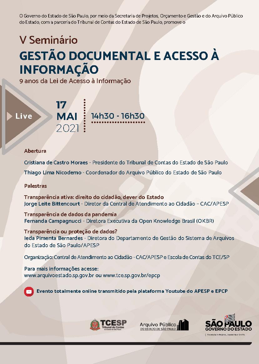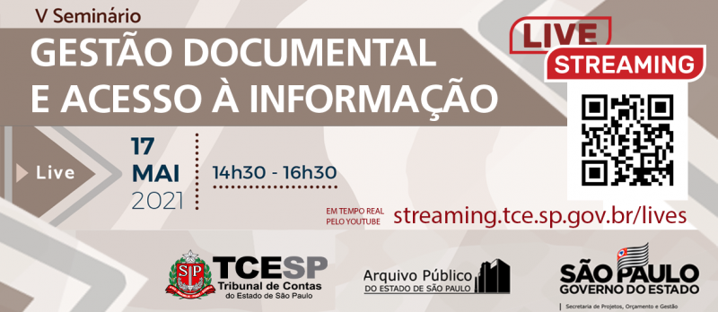V Seminário Gestão Documental e Acesso à Informação Nove anos da Lei de Acesso à Informação Data: 17/5/2021 - 14h30 às 16h30. Transmissão: YouTube http://streaming.tce.sp.gov.br/lives/ Mais informações: www.arquivoestado.sp.gov.br