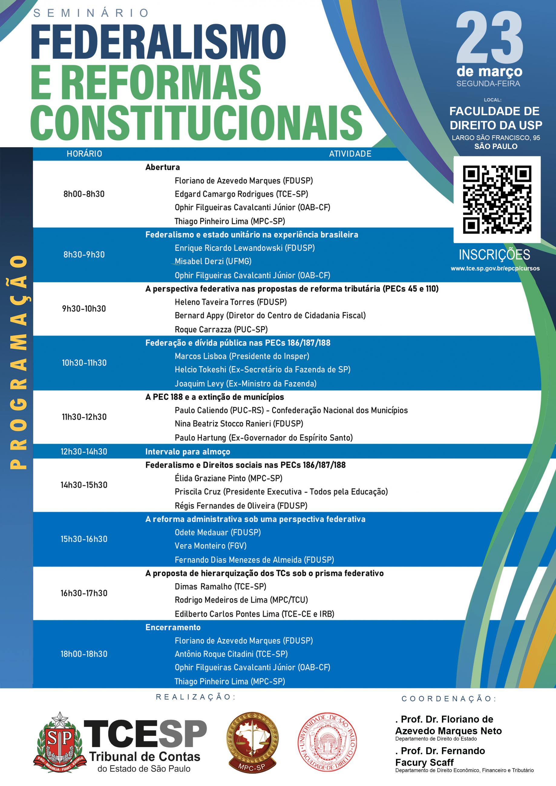 As atividades, gratuitas, acontecem das 8h00 às 18h30, na Faculdade de Direito da USP, e têm como objetivo analisar Propostas de Emenda à Constituição (PEC) à luz do princípio federativo (confira a programação). As inscrições estão abertas e podem ser feitas pelo link www.tce.sp.gov.br/epcp/cursos.