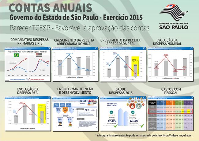 De acordo com o voto, em 2015 foi registrada uma queda na arrecadação de receita de R$ 12 bilhões (sendo R$ 8 bilhões relativos ao ICMS), o que foi compensado pelo Governo do Estado por meio da redução das despesas no total de R$ 16 bilhões, sendo verificado um superávit financeiro de R$ 13,6 bilhões.