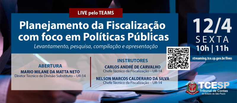 25/03/2024 – SÃO PAULO – O Tribunal de Contas do Estado de São Paulo (TCESP) realiza, na sexta-feira (12/04), das 10h00 às 11h00, live com o tema ‘Planejamento da Fiscalização com foco em Políticas Públicas: levantamento, pesquisa, compilação e apresentação. A atividade, voltada exclusivamente aos servidores do órgão, será realizada pelo Teams (http://streaming.tce.sp.gov.br/lives).