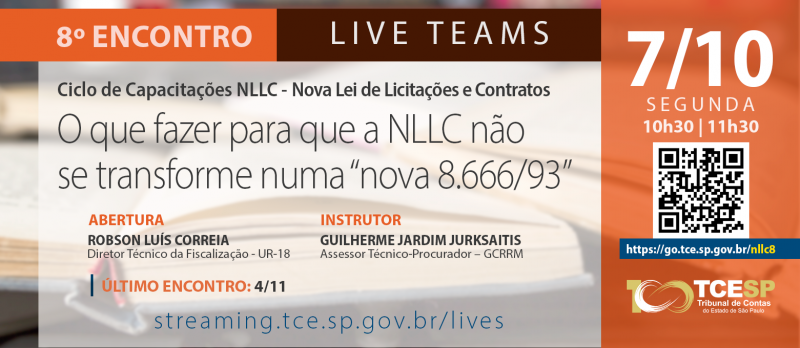 Voltada somente aos servidores na plataforma Teams (https://streaming.tce.sp.gov.br/lives/), a live terá a participação do Diretor Técnico de Divisão da Unidade Regional de Adamantina (UR-18), Robson Luís Correia e instrução do Assessor Técnico-Procurador do TCESP, Guilherme Jardim Jurksaitis.