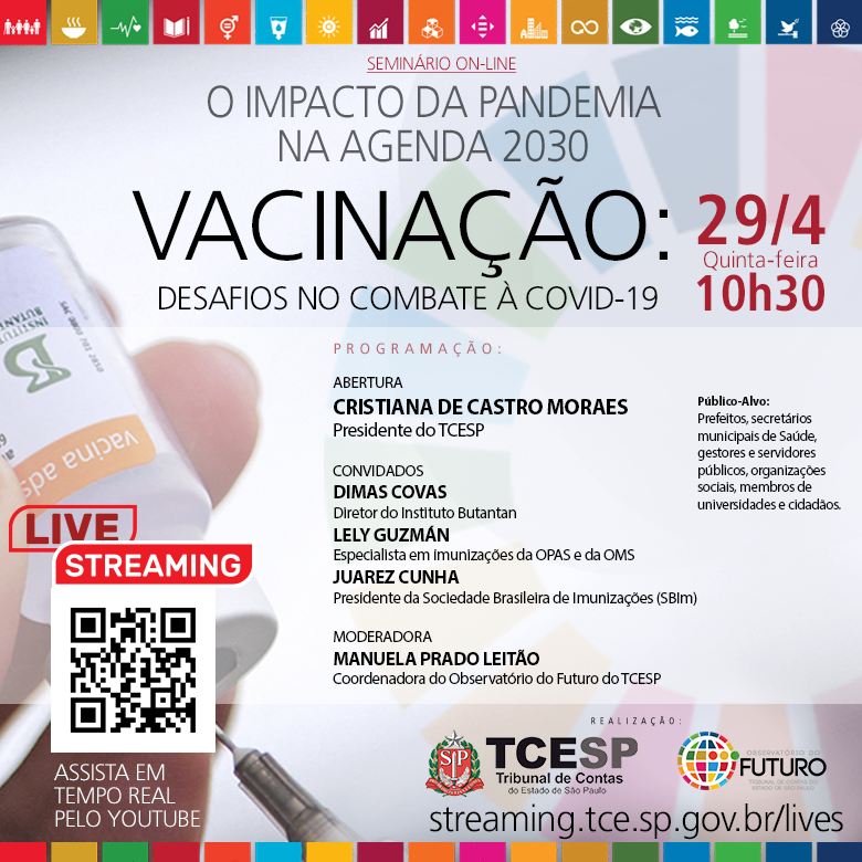 26/04/2021 – SÃO PAULO – Os desafios da campanha de vacinação contra a COVID-19 no Estado serão tema de encontro virtual organizado na quinta-feira (29/4) pelo Tribunal de Contas do Estado de São Paulo (TCESP), por meio do Observatório do Futuro, núcleo de monitoramento dos Objetivos de Desenvolvimento Sustentável (ODS) da Corte.