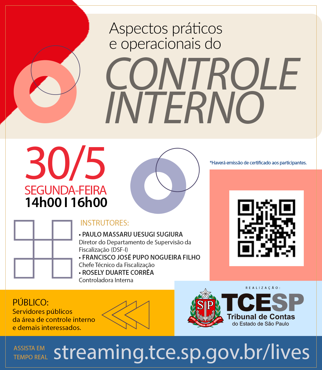 19/05/2022 – SÃO PAULO – O Tribunal de Contas do Estado de São Paulo (TCESP) realiza na segunda-feira (30/5), das 14h00 às 16h00, no Auditório Nobre ‘Professor José Luiz de Anhaia Mello’, na Capital, com transmissão em tempo real pela internet, a palestra ‘Aspectos Práticos e Operacionais do Controle Interno’.