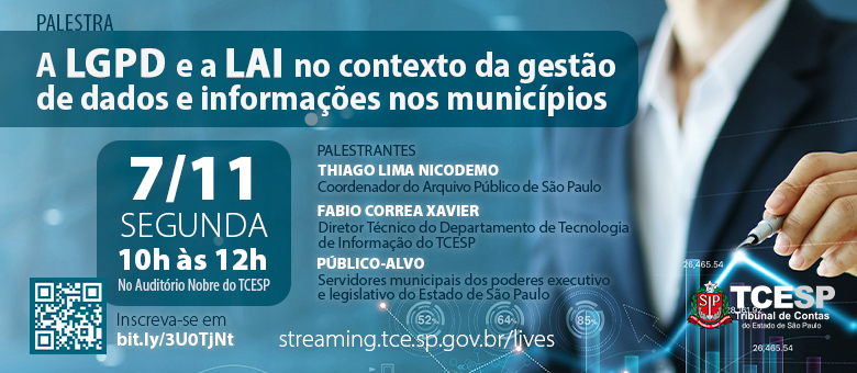 01/11/2022 — SÃO PAULO — O Tribunal de Contas do Estado de São Paulo (TCESP) realiza, na segunda-feira (7/11), das 10h00 às 12h00, no Auditório Nobre ‘Professor José Luiz de Anhaia Mello’, na Capital, palestra sobre a Lei Geral de Proteção de Dados Pessoais (LGPD) e a Lei de Acesso à Informação (LAI) no contexto da gestão de dados e informações nos municípios.