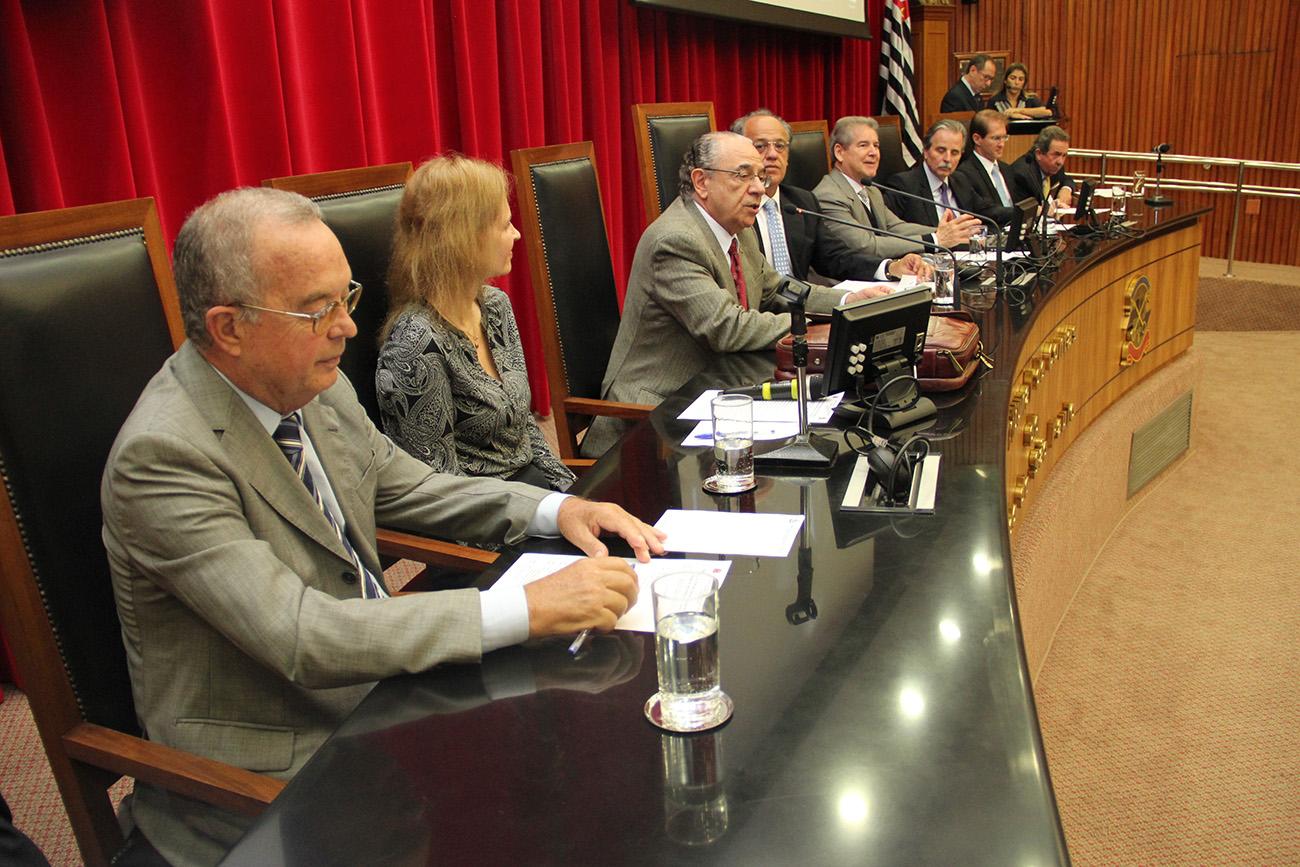 Participaram da mesa solene de abertura dos trabalhos, ao lado do Presidente do TCESP, Conselheiro Dimas Eduardo Ramalho, o Presidente do Instituto Rui Barbosa (IRB) e Presidente do Tribunal de Contas do Estado de Minas Gerais (TCE-MG), Sebastião Helvécio e o Vice-Presidente do Tribunal de Contas do Município de São Paulo (TCM-SP), Maurício Faria.