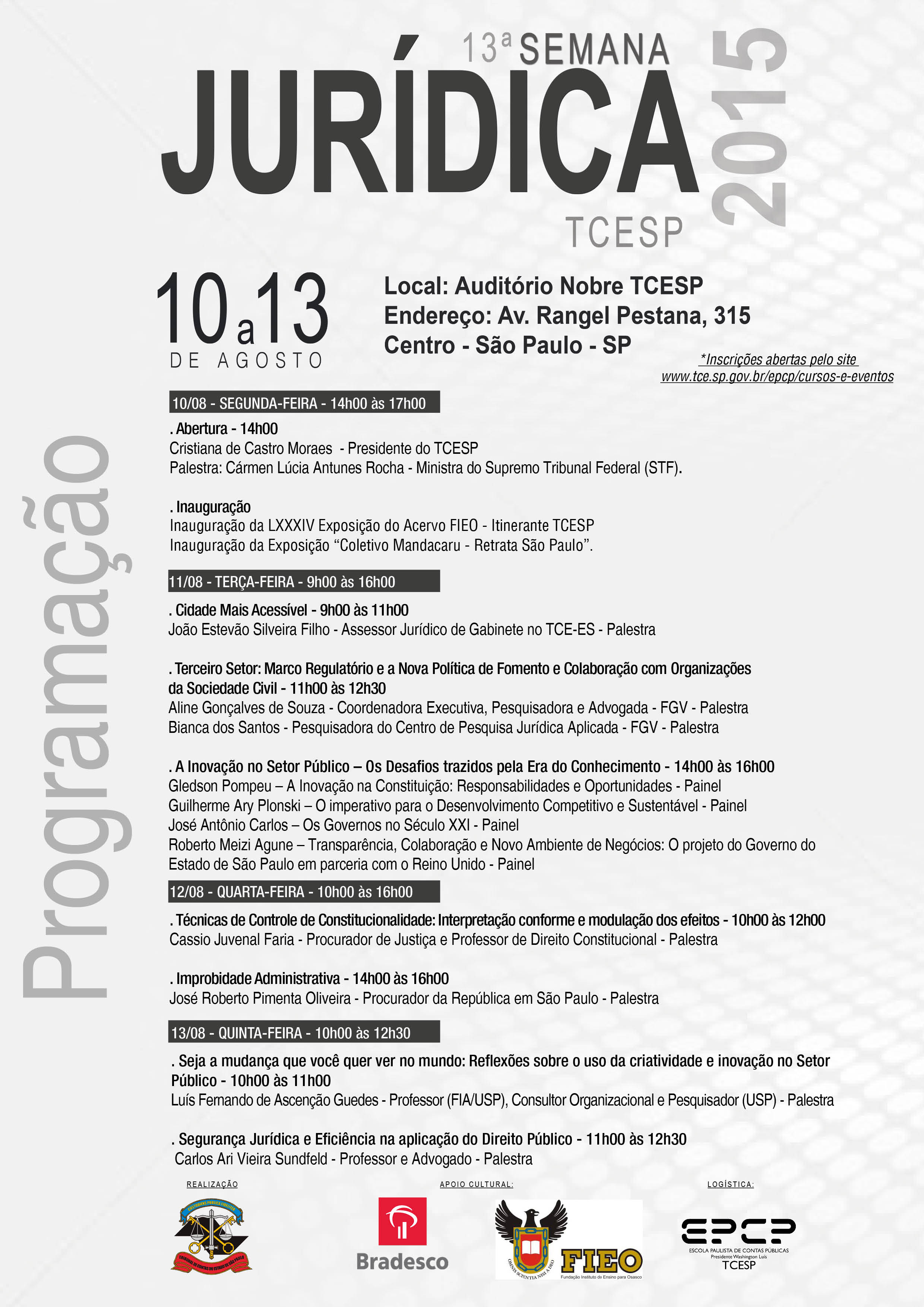 23/07/15 – SÃO PAULO – O Tribunal de Contas do Estado de São Paulo (TCESP), por meio da Escola Paulista de Contas Públicas ‘Presidente Washington Luís’ (EPCP), promoverá, no mês de agosto, entre os dias 10 e 13, em São Paulo, a 13ª edição da Semana Jurídica, voltada para servidores e representantes de órgãos da Administração Pública. O evento é realizado anualmente pela Corte de Contas e contará com palestras e debates que ocorrerão durante toda a semana (confira a programação).