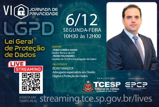 29/11/2021 – SÃO PAULO – O Tribunal de Contas do Estado de São Paulo (TCESP) realiza, na segunda-feira (6/12), das 10h30 às 12h00, a sexta e última edição do ano da Jornada de Privacidade, evento online que tem como intuito abordar a Lei Geral de Proteção de Dados (LGPD), principalmente em relação ao seu impacto no setor público.