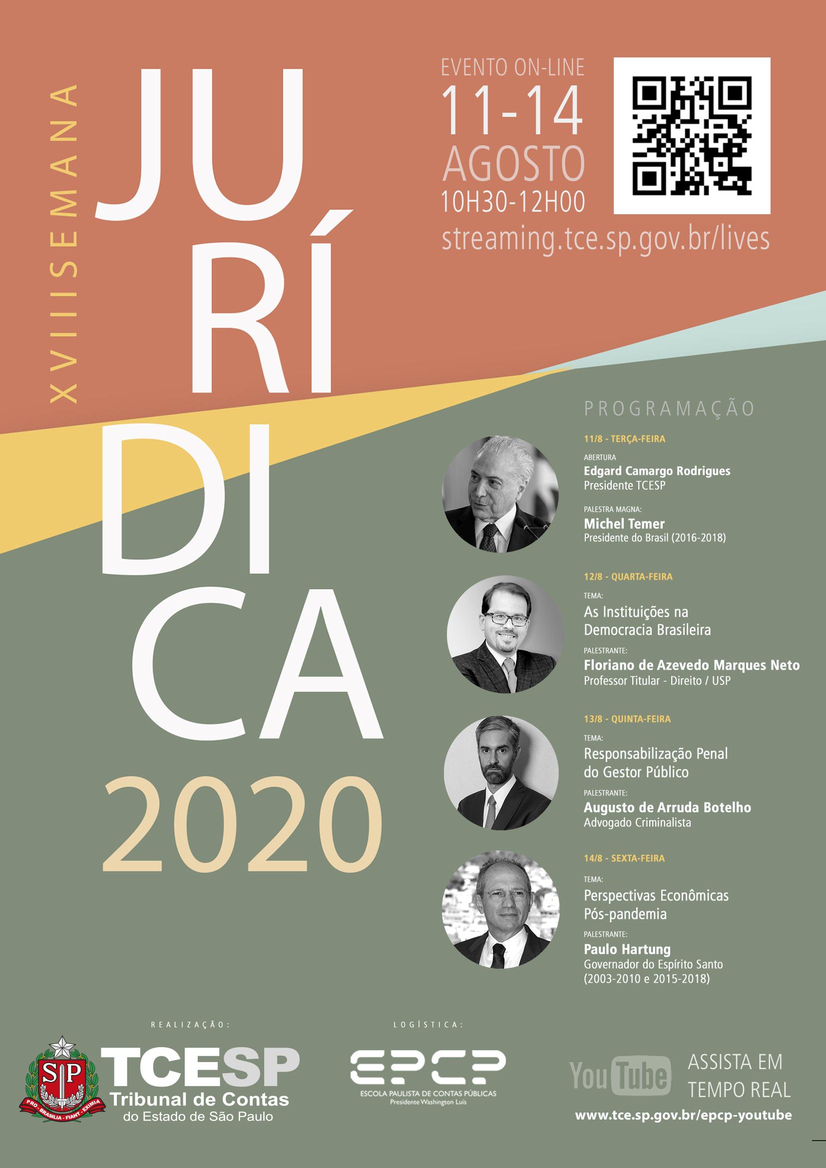 31/07/2020 – SÃO PAULO – O Tribunal de Contas do Estado de São Paulo (TCESP) promove, de 11 a 14 de agosto, a XVIII Semana Jurídica. Entre os convidados desta edição, que ocorre de forma totalmente on-line em função das medidas adotadas para o controle da pandemia do novo coronavírus, está o Presidente do Brasil (2016-2018), Michel Temer.