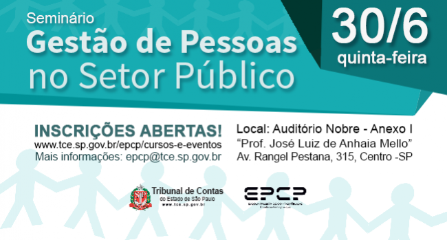 Clique para fazer sua inscrição 22/06/16 – SÃO PAULO – O Tribunal de Contas do Estado de São Paulo (TCESP) realizará na quinta-feira (30/6), das 9h30 às 12h00, no auditório nobre ‘Professor José Luiz de Anhaia Mello’, em São Paulo, o Seminário ‘Gestão de Pessoas no Setor Público’, que reunirá profissionais, estudantes...
