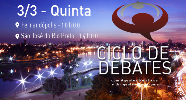Clique para acessar o calendário 01/03/16 – SÃO PAULO – Gestores e servidores públicos de 92 (noventa e dois) municípios da região Noroeste paulista participarão, na quinta-feira (3/3), às 10h00 em Fernandópolis, e às 14h00 em São José do Rio Preto, dos debates que integram a 20ª edição do Ciclo de Debates com Agentes Políticos...