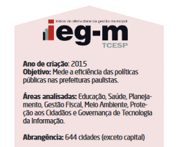 Desde 2015, o Tribunal de Contas vem criando indicadores para avaliar o resultado das políticas públicas e o real impacto dessas iniciativas na vida dos cidadãos. O IEG-M (Índice de Efetividade da Gestão Municipal) mede a eficiência das Prefeituras a partir da análise de quesitos sobre educação, saúde, gestão fiscal, proteção aos cidadãos (defesa civil), planejamento, meio ambiente e governança em tecnologia da informação.